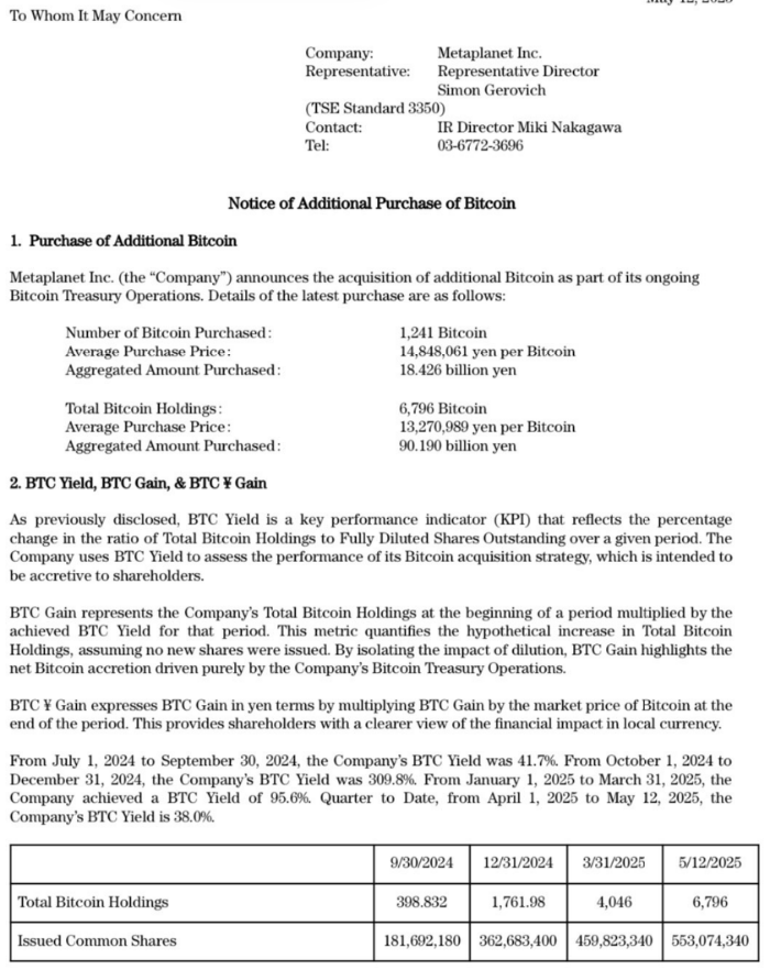 메타플래닛, 1년도 안 되어 6,796개의 비트코인 구매