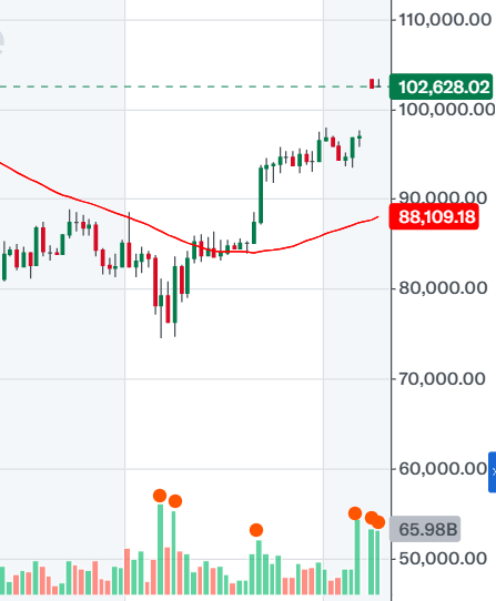 2025년 5월 9일 기준, 10만 달러를 상방 돌파한 후에도 상승세가 이어지고 있지요.