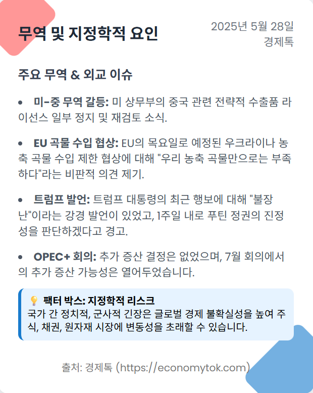 미 상무부의 중국 관련 전략적 수출품 라이선스 일부 정지 및 재검토 소식은 미-중 무역 갈등의 지속적인 우려를 키웠습니다. 또한 EU의 우크라이나 농축 곡물 수입 제한 협상에 대한 비판적 의견과 트럼프 대통령의 푸틴 정권에 대한 강경 발언 등 지정학적 리스크도 시장의 불안감을 가중시켰습니다. OPEC+ 회의에서 추가 증산 결정이 없었던 점도 원유 시장의 불확실성을 남겼습니다.