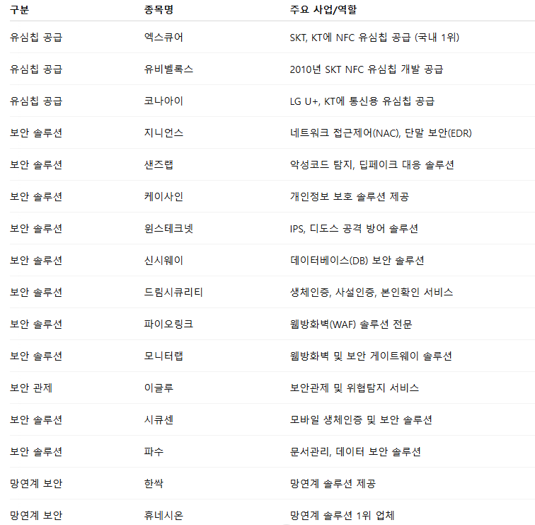 특히 엑스큐어, 유비벨록스, 지니언스, 아이씨티케이처럼 이번 이슈와 직접적인 연결 고리가 있는 기업들은 단기 트레이딩뿐 아니라 향후 성장 가능성까지 함께 고려해볼 필요가 있습니다.